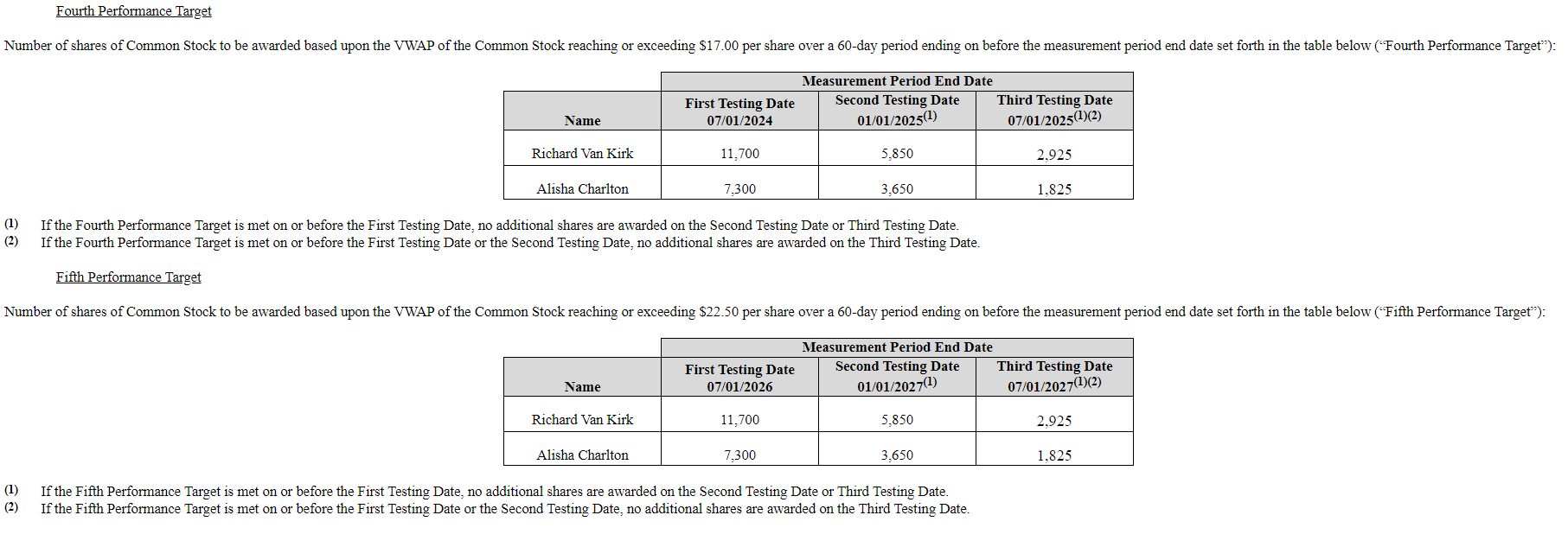 So, with that in mind, I’ll refer you all the way back to December 2017. PDEX’s stock was trading for ~$7/share, and the company put out an 8-k that had some very interesting performance targets for their CEO and CFO (what I will call “the first grant”). Each exec was granted stock that vested if the share price achieved a certain price by a certain time. For example, the screenshot below includes the fourth and fifth performance target. If you look at the fourth performance target, the CEO would be given 11.7k shares if the stock’s VWAP was $17/share before July 1, 2024. If he missed that target but did it by January 1, 2025, he’d be given 5,850 shares instead. If he missed that, he could get ~2.9k shares by hitting the target by July 1, 2025. After that, the target failed and he got nothing.