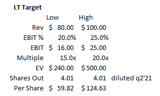 It’s tough to estimate how high margins could go if and when PDEX approaches their growth targets, as there’s no perfect comp for PDEX. Still, just triangulating a little bit based on their current trends, loose peers, and a little industry experience, I don’t see any reason why PDEX’s long term EBIT margins can’t approach 25%; I actually think they could go higher in the right scenarios but let’s just say PDEX could hit 20% margins (which they did in 2020) on the low end and 25% on the high end. If we applied those multiples to the $80-100m in sales capacity, PDEX could do $16m in EBIT on the low end and $25m on the high end. Slap a 15-20x EBIT multiple on those numbers (probably conservative; loose peers trade at 20-25x EBITDA), and we’re looking at a share price of $60/share on the low end and ~$125/share on the high end.