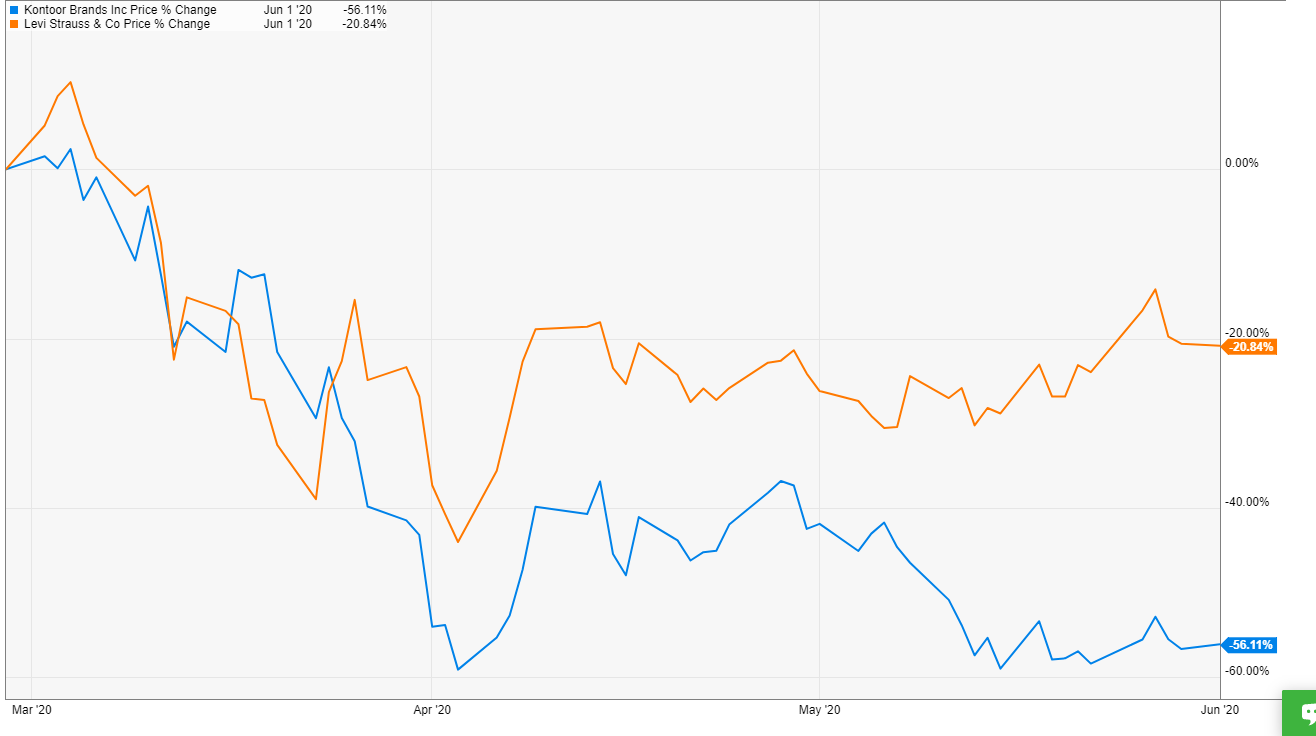 Let’s fast forward to today. Shares have been absolutely hammered so far this year, falling by ~66% (from ~$41 to ~$14). In fact, KTB is one of the few stocks yet to recover from the lows of March, with KTB’s shares retesting the March lows several times this month.