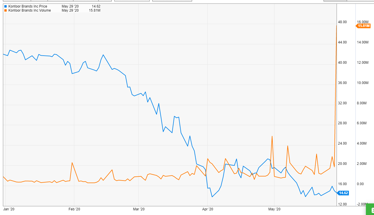 What gives? Well, notice the chart above includes both share price and volume (the orange line), and KTB’s volume has absolutely spiked over the past few days, culminating in a mammoth ~16m shares traded last Friday. That’s an enormous amount; KTB has just 58m shares outstanding, so on Friday alone more than 25% of the company traded hands.