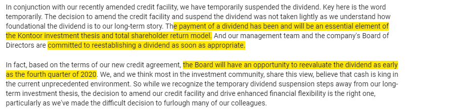 KTB has consistently made clear they are a dividend focused company. When discussing the dividend cut, the company explicitly stated they planned on turning the dividend back on as soon as they could, and suggested that could be as soon as Q4 (below quote from their Q1'20 earnings call).