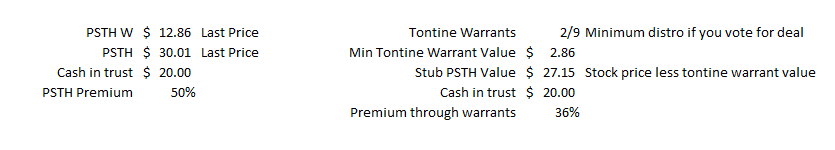 Remember, PSTH is a tontine structure. I'd encourage you to read their S-1 for full details on how the structure works, but basically if you're a PSTH shareholder and you vote for their deal, you are given at least 2/9 of a warrant as a reward. That number could actually increase, as the shares that vote not to redeem are given the warrants from the shares that vote to redeem (so if you own shares and vote to redeem, your 2/9 of a warrant are given to all of the shareholders who do not redeem. Thus, the tontine structure).