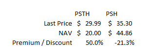 Remember, PSTH is a SPAC. A SPAC is a cash shell; investors buy into it hoping that the SPAC's management team will find a deal that creates value. When a SPAC trades at a premium to NAV / cash value, it's doing so because investors are betting that the manager will find a deal that creates a ton of value... which makes it strange that PSTH trades at such a big premium while PSH trades at a discount. They are both managed by the same person (Ackman), yet investors are willing to pay a huge premium to invest in one (PSTH) while demand a huge discount to invest in the other (PSH). Effectively, investors are saying that one pool of money managed by Ackman will create enormous value through his capital allocation skills (and thus should trade at a huge premium) while another pool of money he manages will suffer enormous value destruction through his capital allocation incompetence (and thus should trade at a huge discount).