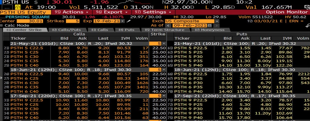 I've pasted a screenshot of the current PSTH option chain from May through September below (note: current = as of 8 PM EST Feb. 9). You can see that implied volatility (the "IVM" column) is running at ~100.