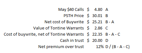 Anyway, some of this is a little looser, but I think it's all directionally correct. Bottom line, given the uniqueness of the tontine structure, the open questions of how many warrants are attached to a share (and how valuable / volatile those warrants will be post deal), and how the embedded warrant value inside a PSTH share today means shares are a little cheaper than they appear at first glance, I think that PSTH presents an interesting case for mispricing, particularly once the high volatility from the options is factored in.