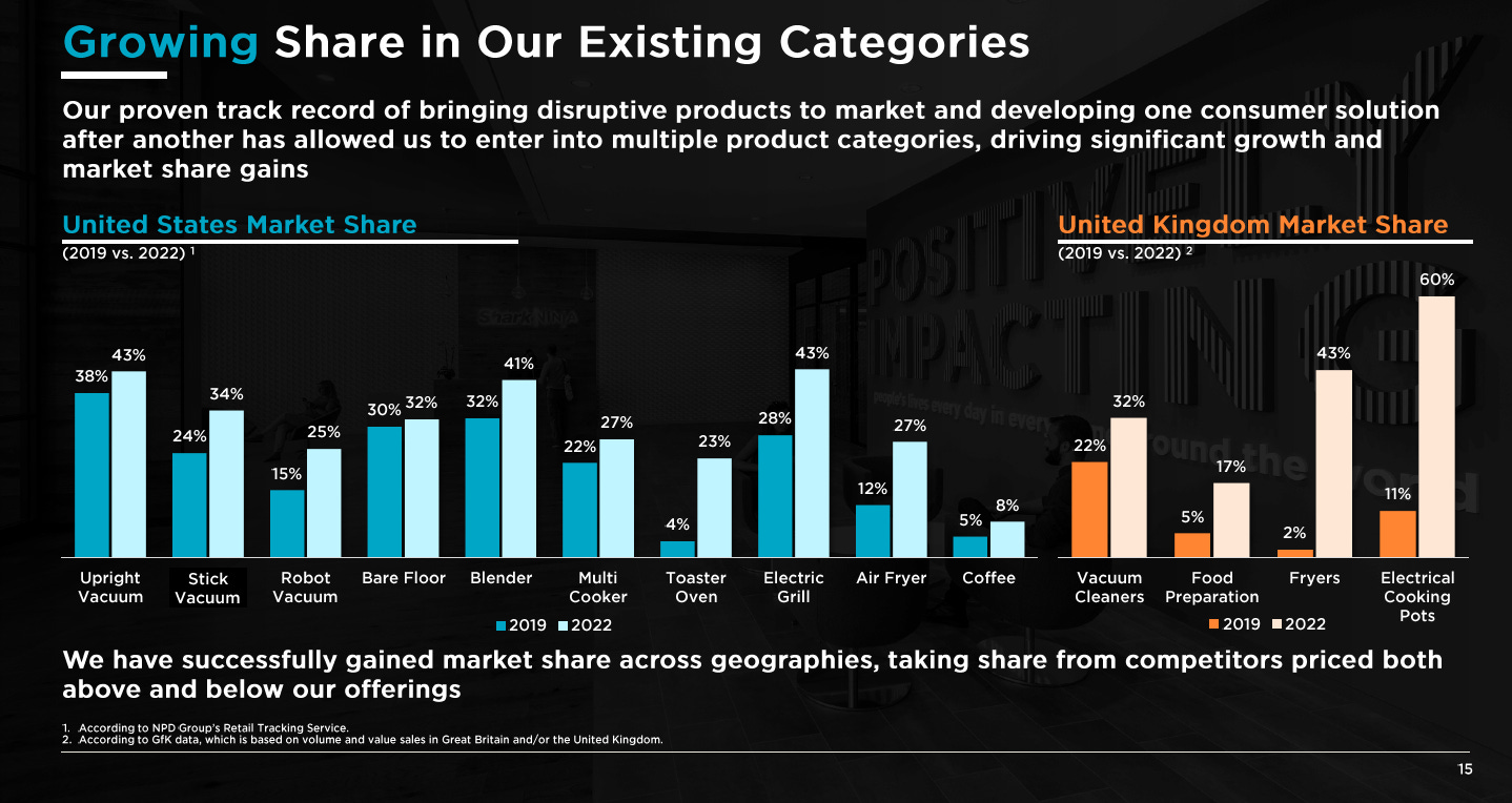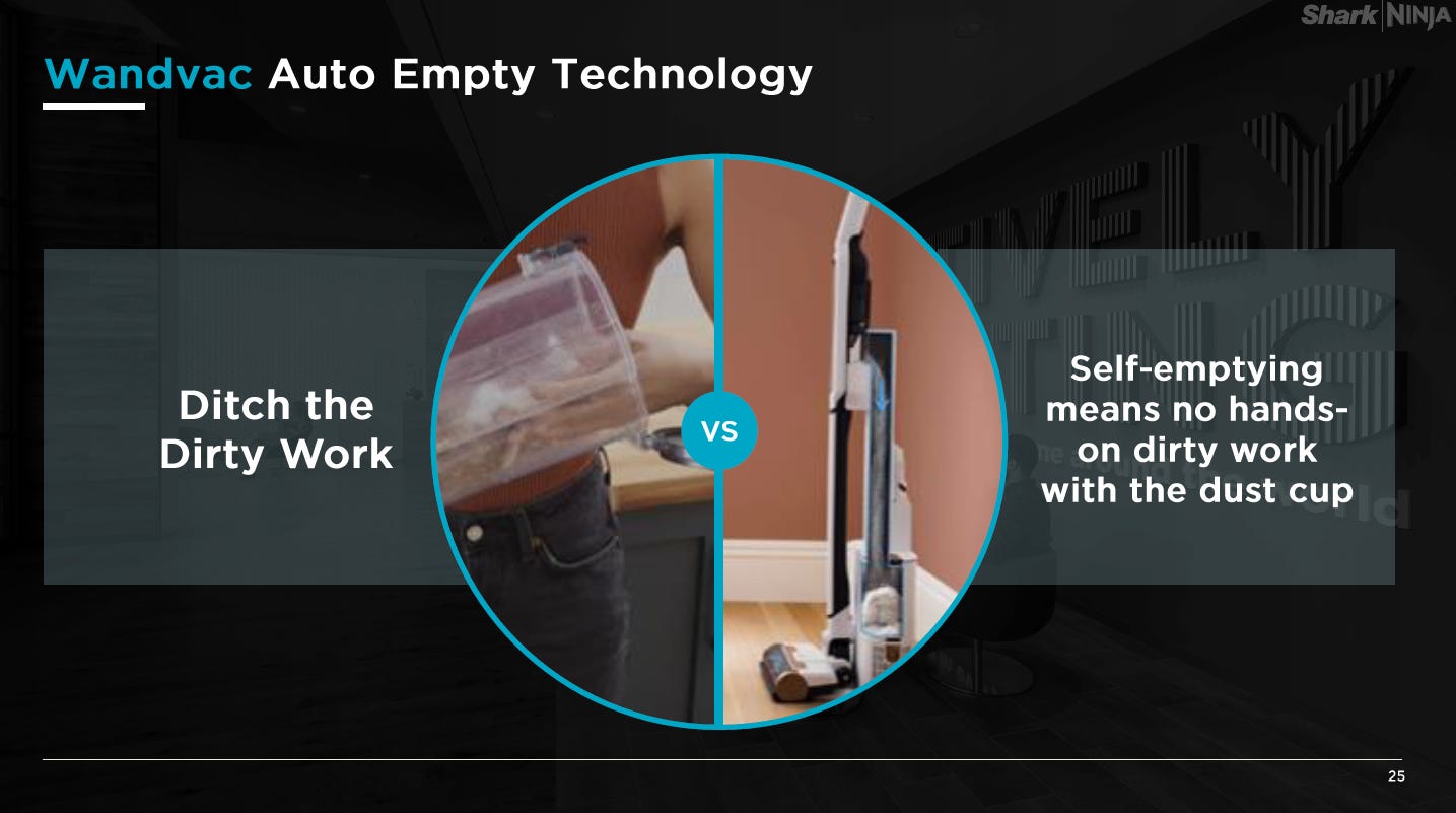 The company’s pitch is simple: they move into categories with better products at lower price points than peers, and that combo lets them take huge share. In particular, the company points to how much better they understand consumers in their research and how the products they release have consumer friendly features that other products don’t have. For example, in their investor deck, the company points out that competitor vacuums require manual emptying, while Shark’s are self-emptying. Another example: in a call with IR, they mentioned to me how their researchers followed consumers as they vacuumed their house, and how they noticed the consumers were taking scissors to cut hair out of the vacuum. When the researchers asked consumers how the vacuuming went, they’d say great and sheepishly apologize when asked about cutting the hair out of the vacuum. That research led Shark to launch a vacuum that wouldn’t clog with hair.
