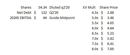 Let's turn to the second point: at deal price, ALSK is cheap. The current deal values ALSK at a $300m EV. The company was guiding to ~$64m in EV (per their Q2'20 slides; see below), so we're talking about a ~4.5x EBITDA multiple.