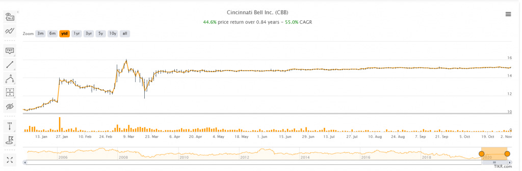 Let me start with the later point: bidding wars in the space. Earlier this year, Cincinnati Bell (CBB) had a wild bidding war. It started when Brookfield Infrastructure agreed to buy them for $10.50/share (a 36% premium to their closing price and an 84% premium to their 60-day VWAP). It ended with Macquarie Infrastructure agreeing to acquire them for $15.50/share (a 101% premium to their December closing price and a 172% premium to their 60 day VWAP); in addition, CBB had to pay Brookfield ~$29m in breakup fees (representing another ~$0.60/share of value).
