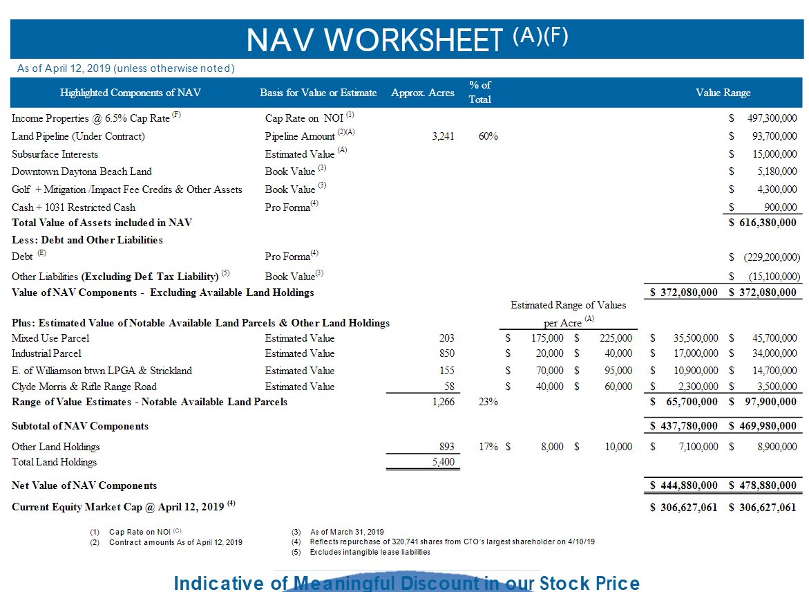 Let me take a step back on HHC. HHC isn't exactly an unknown company among value investors; it's a large position for Pershing Square / Bill Ackman (disclosure: long PSH), and Ackman has talked about the company and its value pretty frequently (in both his shareholder letters and in a 2017 pitch at Sohn... which he did when shares were trading around their current price in the mid-$120s). HHC's management has also frequently suggested shares traded below NAV, and many investors (myself included!) liked how management used their own money to buy LT warrants on HHC stock, as it seemed to reasonably align management with shareholders. Anyway, what's so interesting to me is that HHC had a huge "pop" on their strategic alternative announcement, with shares up ~35%. That's the type of pop I'd expect to see from a company announcing a signed, definitive merger agreement. To go up 35% simply on announcement of reviewing alternatives suggests the market was valuing HHC for significantly less than their private market value. Of course, there is an argument to be had about why the market was undervaluing HHC's assets (i.e. was the market discounting the assets too heavily, or was the market skeptical of HHC's capex / investment plans?), but with that type of pop it's tough to argue that HHC was fairly valued pre-announcement. Bulls have long argued that HHC was mispriced because it didn't fit neatly into any bucket. HHC wasn't a REIT with huge cash flows and a high dividend payout like most other real estate companies, so a lot of natural real estate investors didn't look at it. HHC's assets were a hodge podge of unrelated assets (prime Hawaiian real estate, a downtown NYC development, master planned communities in Las Vegas and Houston) that had no real reason to be together and that demanded very different valuation methodologies, and while many of those assets would have significant value in the long term, in the short run they were an earnings drag and (you could argue) the market was failing to fully value the assets given how far away the payday for those developments were. HHC's stock was also a bit on the illiquid side given a few longer term value type funds (Horizon Kinetics, Pershing, etc.) had decent sized positions in it, and some institutions may have been scared to step into the stock given that relative illiquidity and the potential for short term share price weirdness if a large block decided to liquidate (as happened last year when Pershing trimmed their stake). That HHC pop makes me wonder: is/was the HHC undervaluation HHC specific, or is it specific to all land bank type companies? The two companies that "pop" into my mind are JOE and CTO (disclosure: long a tracking position in JOE), as both have huge similarities to HHC. All of them have the same "doesn't fit neatly into any bucket" issue. All have ties to famous value investors who have struggled recently (HHC obviously has Ackman as a large shareholder and chairman; Fairholme owns just under half of JOE's stock and Berkowitz serves as Joe's chairman; Wintergeen owned ~30% of CTO for years but sold all of their shares in the middle of last year after several failed proxy battles), all control huge swaths of land and are actively developing them, all have seen their share prices more or less stall out over the past five years despite continued progress in developing that land, and all have relatively consistently argued that their shares trade far below their NAV (CTO even publishes an estimate of their NAV in their investor presentations; I've included a screen shot below), all argue that their NAV is continuing to grow at an impressive clip (despite what their stalled out share prices say), and all argue that they are realizing really attractive returns on their growth / development capex (for example, JOE has argued 10% unlevered returns on their growth capex, which obviously creates tons of equity value, and I believe HHC made similar arguments on the returns from their growth capex). I'm not saying any of these companies are perfect comps: HHC's assets are far better than JOE and CTO, and CTO appears much further along in having fully developed their asset base versus the other two (I haven't followed CTO as closely as JOE or HHC, so that's a more 30k foot observation), but nonetheless there are significant similarities between the three.