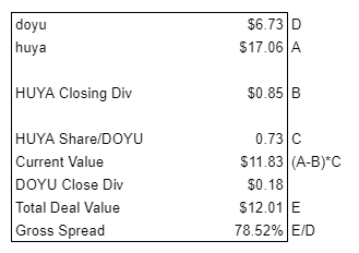 Since the merger announcement, DOYU and HOYU shares have traded reasonably in line with each other. However, in May, the spread between the two started to widen, and that gap got even larger over the past week. As I write this, DOYU is trading for ~$6.75/share; if the HOYU merger closed tomorrow, DOYU would be worth ~$12/share (see math below; I’ve adjusted for dividends on both sides though even at a glance you can see how big the discrepancy is!). That’s an absolutely insane gap.