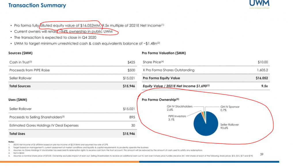 Put the combination together and you have the potential for a squeeze higher. Again, UWMC is coming public with only ~6% of their float (~$1B) in the free float. Once you factor in the sponsor shares and the PIPE, the actual trading amount of shares available is even lower for the near future (probably closer to $500m shares tradeable). If and when Gores starts getting added to indices, there is going to be a lot of forced buying into a very small amount of available shares. Shares could rocket higher given that dynamic.