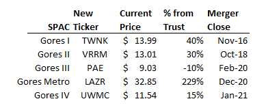 PS- I included the chart below in my original GHIV write up, but I figured I'd update it because it's helpful for framing the idea. UWMC / GHIV is actually Gores' 5th SPAC; below is the performance of all five SPACs so far. Performance so far has been excellent; I think you could easily argue that Gores is the best non-Chamath SPAC sponsor. I highlight this just so you know who you're betting on with UWMC; their history shows they are real sponsors that make winning deals. Given everything discussed above, I expect UWMC will fall into that "winning deals" camp.