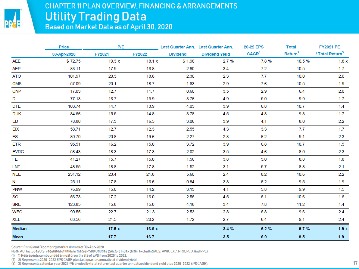 That's far, far below peer utilities. Regulated utilities are a pretty predictable business. They're natural monopolies, and state regulators set what they can earn. So while I'm normally hesitant to give credit to a company's projections, there's a reasonably strong chance that PCG's projections are grounded in reality and will get hit. Because these are natural monopoly businesses with regulated returns, utilities are generally regarded as "safe" investments and beloved by investors looking for stable investments. Most regulated utility company trade for a high teens P/E (take a look at the components of the XLU, or just see the utility data below from PCG's May 2020 Chapter 11 pres), a huge premium to where PCG trades. A big part of the appeal of utilities is their stable / steady dividend; as part of their bankruptcy, PCG agreed not to pay dividends until they earn $6.2B in non-GAAP core earnings (see p. S-34). Their financial projections don't have them paying a common dividend until 2023.