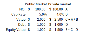 A hypothetical might show this best. Pretend that a publicly traded company owns a bunch of apartments. The stock is trading for a 5% cap rate and is 50% debt / 50% equity; however, similar apartments are trading in the private markets for a 4% cap rate. With those metrics, the stock would be trading for a 50% discount to private market value…. which is completely consistent with the takeout premiums we’ve been seeing in the recent PKST / ALEX / PLYM deals I just listed!