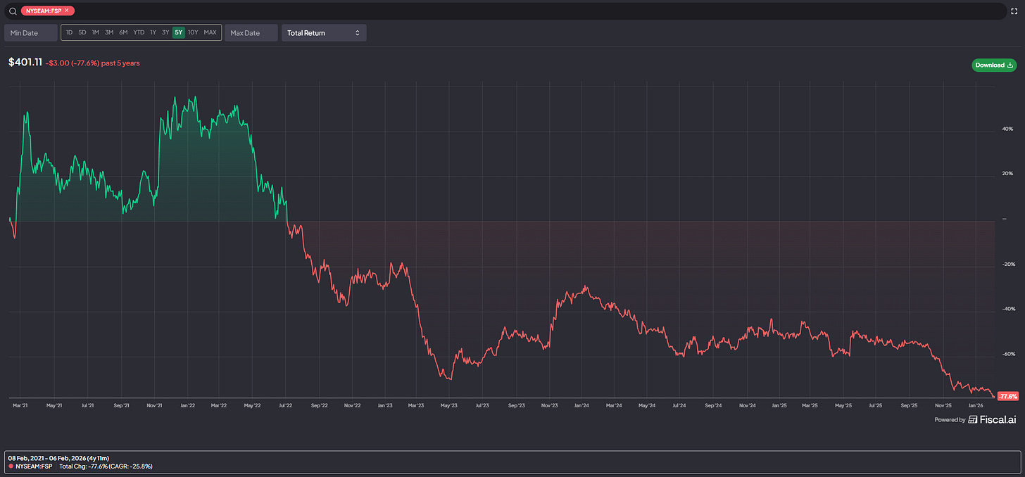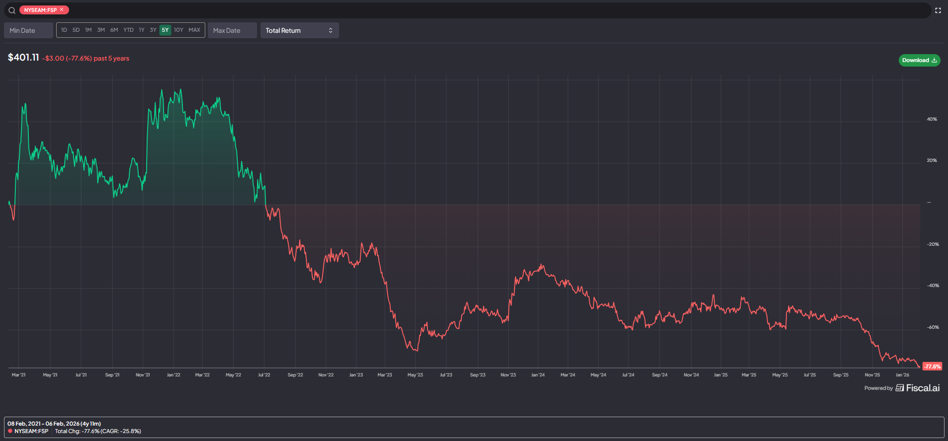 All of which is a very long winded way to bring me to Franklin Street Properties (FSP). FSP is a REIT that owns ~14 office buildings in ~four markets (Dallas, Denver, Houston, Minneapolis). To put it kindly, these are not exactly pristine assets. Office buildings in general aren’t exactly en vogue, and older office buildings with <70% occupancy (FSP’s occupancy at their last quarter was ~69%; nice for the memes, not so nice for the owner!) are basically toxic right now. Of course, you probably didn’t need me to tell you that low occupancy office properties aren’t in high demand; anyone who has followed public (or private!) markets for the last ~5 years knows office is not great, and a quick glance at FSP’s stock chart would have reaffirmed everyone’s priors: