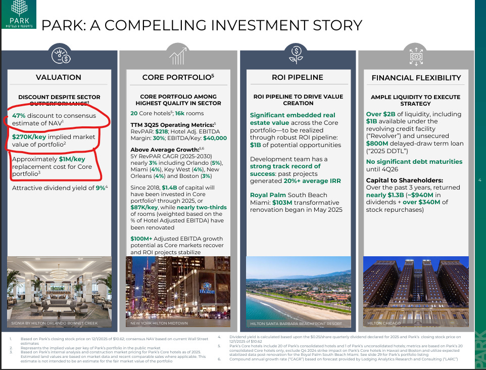 One corner of the market I find fascinating right now is real estate. There are a lot of REITs (and REIT-adjacent) companies that are trading for a large discount to their private market values1. Just to choose one example2: PK has consistently argued that they trade for a huge discount to their NAV and a fraction of their replacement cost.