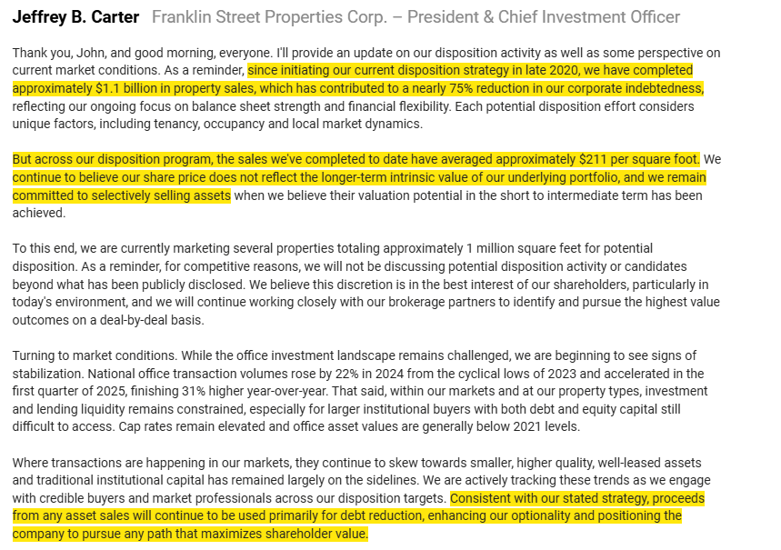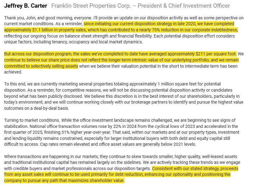 Anyway, I’ve had FSP on my radar because (again) I try to follow any REIT that announces strategic alternatives or anything just given the huge premium take outs I’ve seen / the public to private discounts we’ve seen. I’ve been following FSP for a long time7, but my interest has been piqued up since their Q1’25 earnings call when they said they were “actively considering all options from operational adjustments to strategic transactions and are consulting with several third-party professionals in that regard.” That earnings call is the last one they’ve done; in Q2’25, they formally announced a strategic review with BofA and they haven’t hosted an earnings call since.