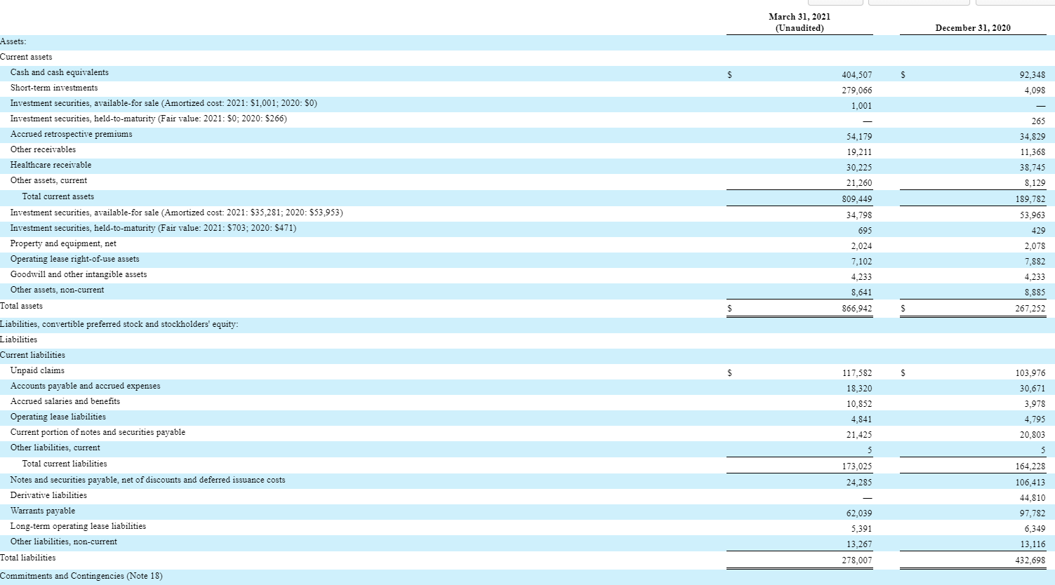 CLOV literally just deSPAC’d earlier this year. Their balance sheet is pristine right now; almost $700m in cash (a bit under $2/share) against basically no debt and limited liabilities (see balance sheet screenshot below). AMC and GME are both meme stocks, and they’ve used their share price to raise a boatload of cash to survive….. but without that, they were quite distressed. CLOV is not distressed; even without raising money, they’ve got a long, long runway before their financial position would be a concern.
