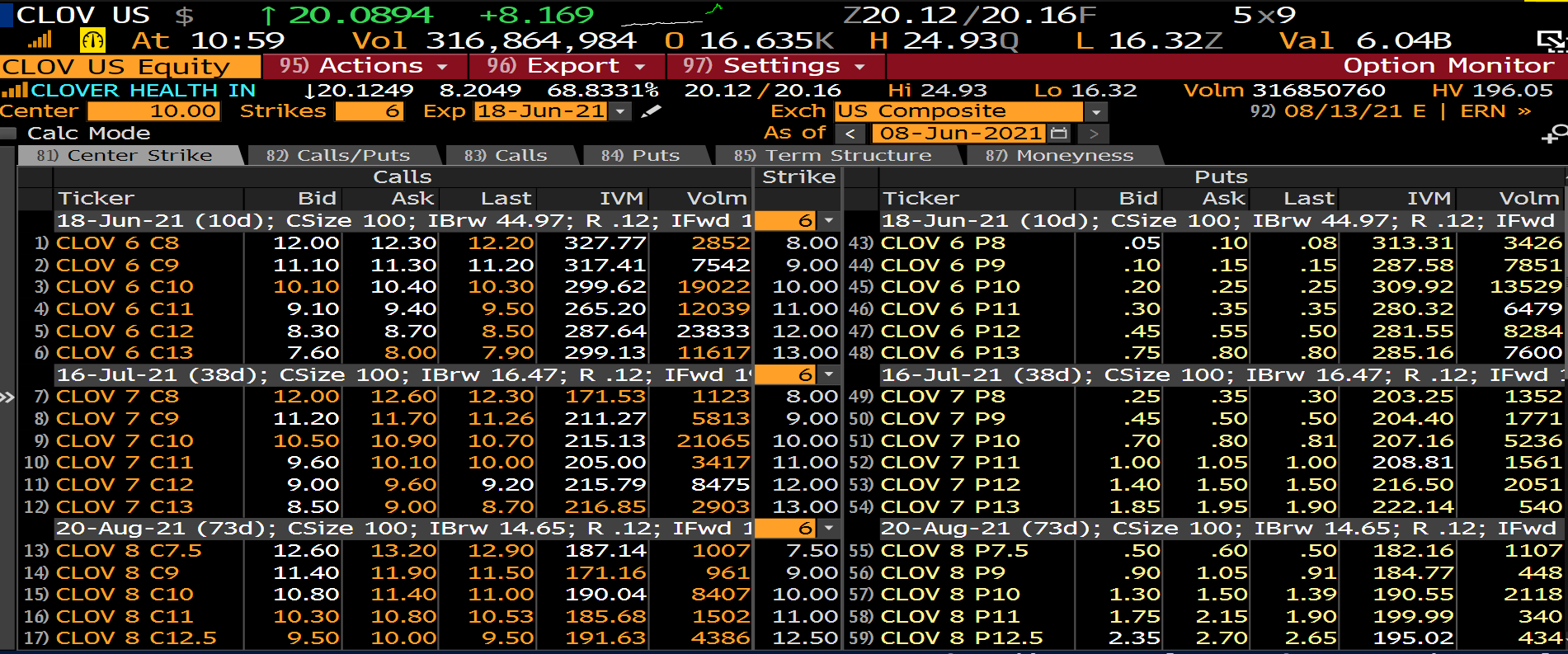 But that background probably isn’t too important at this point. What’s important is CLOV is getting squeezed, and the volatility on this thing is unbelievable. I’ve screenshotted an image of their options chain as I write this below.