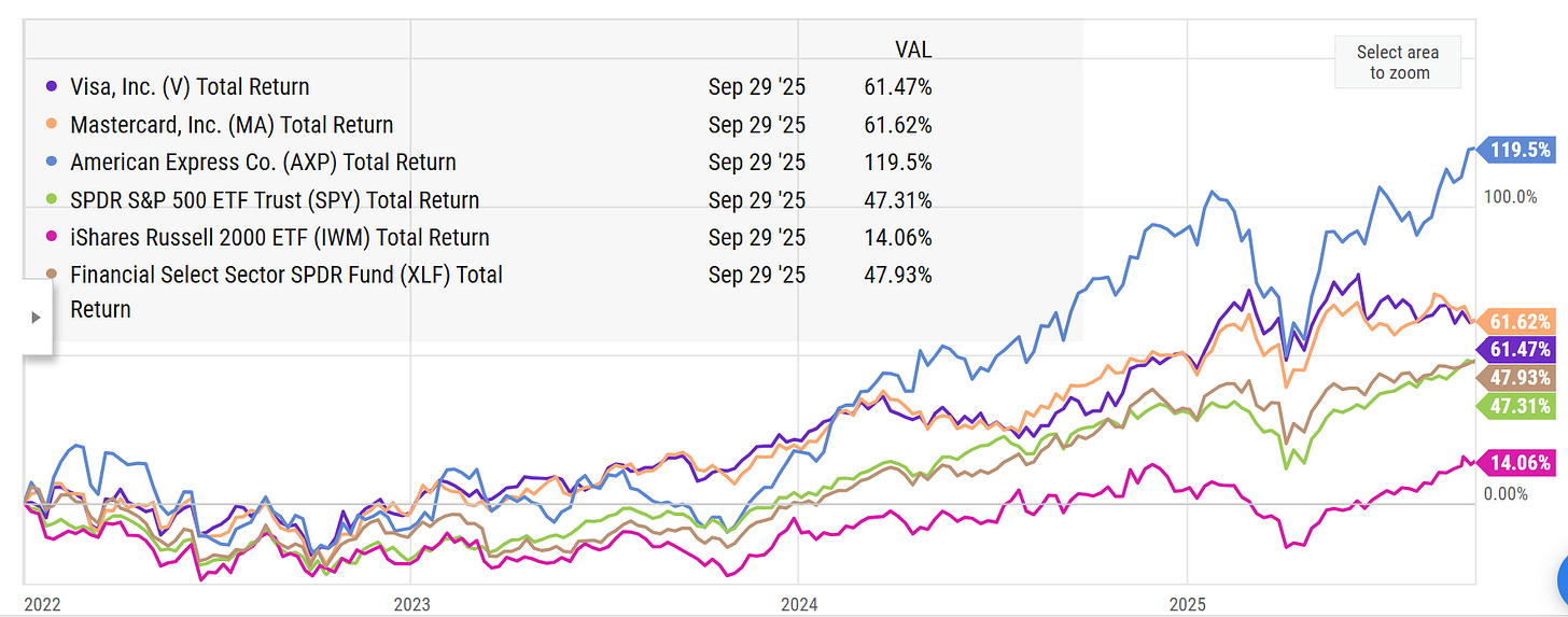 But this “crypto will eat the world” mindset was probably most famously (or infamously) immortalized by Chamath’s prediction for 2022 that crypto would eat the payment rails, making Visa and Mastercard epic shorts (he described short V / MA; long the web3 payment pioneers as “the ‘most profitable spread trade’ of his lifetime.” This prediction has not worked out well; regardless of your index, the payment companies (Visa, Mastercard, Amex) have outperformed over the ~4 years since Chamath’s prediction.