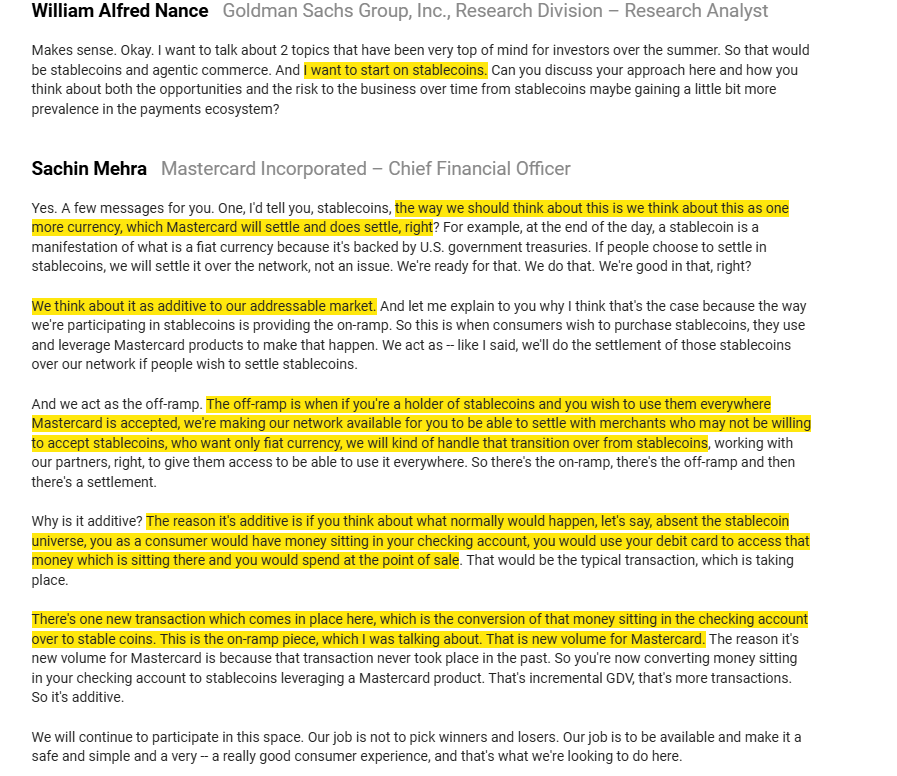I won’t spoil the whole call, but I’ll just note one of the things that I went in really curious about. If you listen to Mastercard and Visa, they’ll tell you that stablecoins are “additive” for their business: