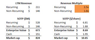 Putting it all together, Shoretel’s recurring revenue business at 2.5x sales would be worth $530m, or ~$6.81/share (assuming all options / RSUs are exercised). The non-recurring business is worth $145m, or ~$1.88/share. They also would have $150m in cash, assuming all stock options are exercised, or another $1.95/share. In total, putting all of those together would mean SHOR is worth ~$10.65/share.