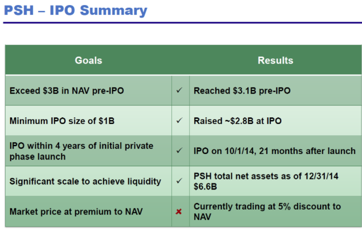 I mentioned last week that I thought PSH might be the most interesting trade here. The company continues to trade at a stubborn discount to NAV, and NAV is likely understated as it includes no value for the sponsor economics in future SPARC deals. I think it has to be really clear that the discount at PSH bothers Ackman. Since the day PSH listed in 2014, Ackman has been saying since that PSH should trade for a premium to NAV. In fact, if you go back and read the slides from when PSH first went public, one of his stated goals was to have PSH trade for a premium to NAV: