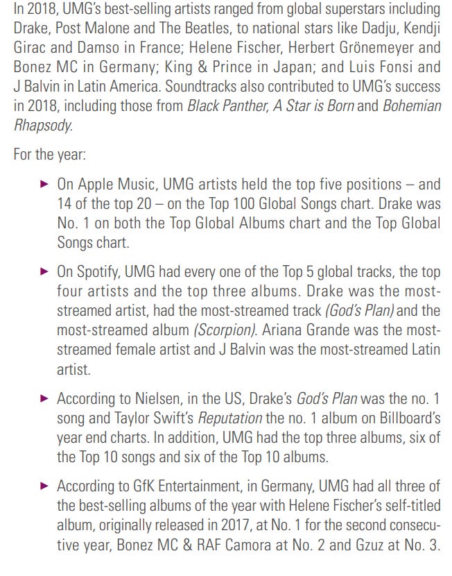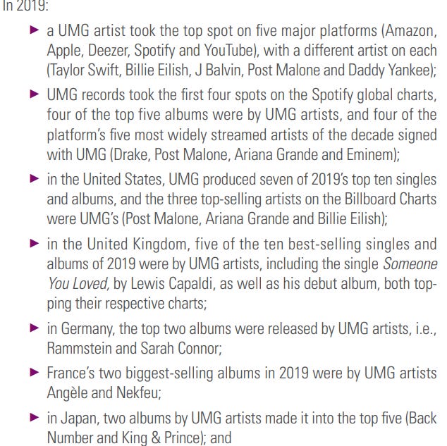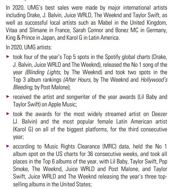 Obviously, that Bloomberg list is just a moment in time snapshot…. but UMG is consistently at the top when it comes to most streamed / popular artists. Here’s how UMG discussed their record in VIV’s 2020 AR:
