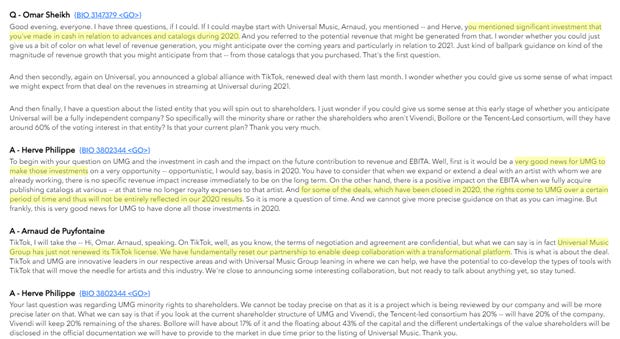I mentioned above that UMG’s artists have consistently been at the top of the charts; that should drive better than average growth for UMG in the long term. Another interesting this is that UMG appears to have made “significant investments” in 2020 that will be “very good news” for UMG in the long term. Again, it’s small, but it’s just another long term growth driver that I don’t think UMG is currently getting credit for but that will eventually flow through to shareholders.
