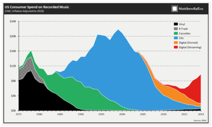 Music has always been a power law business, where the top superstars took home the bulk of the earnings, but that edge has only increased as the world has gotten more global. In 1982, the top touring acts took home 26% of revenue from yours; in recent years, that number went all the way to 60% (source). And it’s not just touring revenue that the superstars dominate; superstar / smash hit music released today is much more likely to have a long live getting played on streaming services (i.e. a modest hit released today is unlikely to make a lot of playlists ten years from now, but a smash hit will get included in tons of “best of” playlists and will generate streaming revenue for years) as well as be much more likely to get played on TikTok videos, in Peloton classes, get licensed for movies, etc.