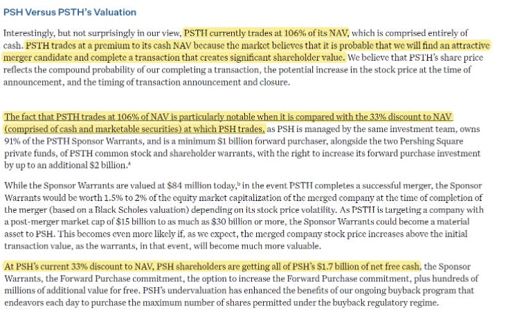 Here’s Ackman talking about how he doesn’t understand why PSTH would trade at such a big premium to cash while PSH trades at a wide discount to NAV: