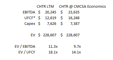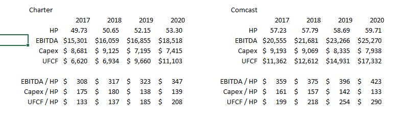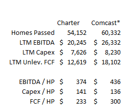 I think the trend is pretty clear; in three years or so, Charter will get to where Comcast is today, and Comcast will probably be approaching $500/HP in EBITDA. I’d love if Charter could close that gap quicker, but still I think we have clear line of sight to Charter getting to where Comcast is now. Run Comcast’s economics on Charter’s homes passed, and they’re trading for <10x “Comcast adjusted” EBITDA and ~14x UFCF.