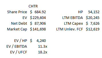 As I write this, Charter is trading for ~$685/share. With ~$89B in net debt, that gives Charter an EV of ~$230B. LTM EBITDA is ~$20B and Unlevered FCF (EBITDA less capex) is ~$12.6B, so at current prices Charter is trading for ~11x EBITDA and 18x unlevered free cash flow.