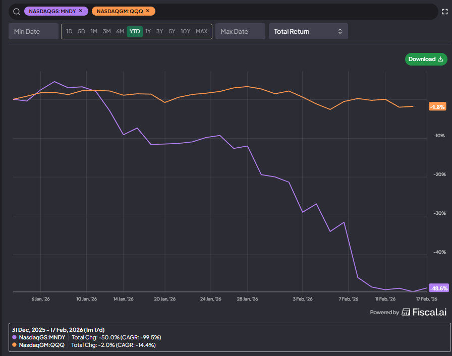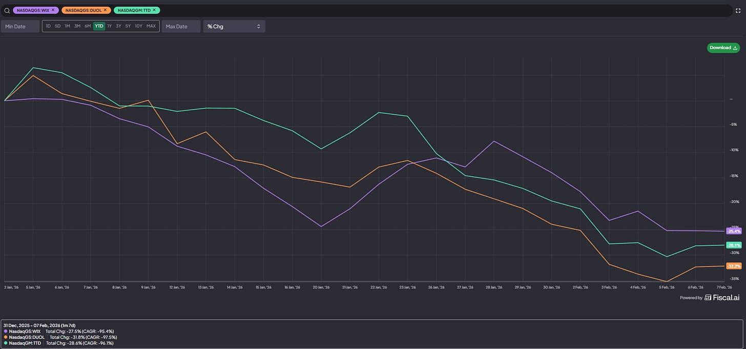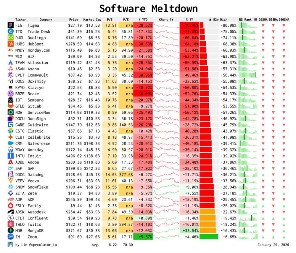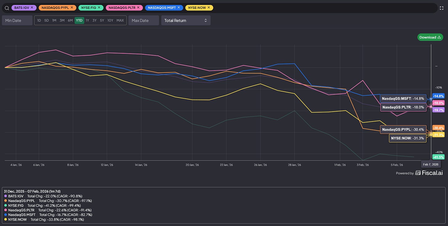 Right now4, we’re clearly seeing an industry implosion in the software (and payments) space5. IGV (the software ETF) was down ~10% last week and is down >20% on the year… but I don’t think that fully captures the pain in the space. IGV has a huge weighting in some large cap software names (PLTR, MSFT, ORCL). Those have certainly not had great starts to the year, but the real pain has been in the smaller and mid cap names, where just about every name is down 30%+ to start the year.