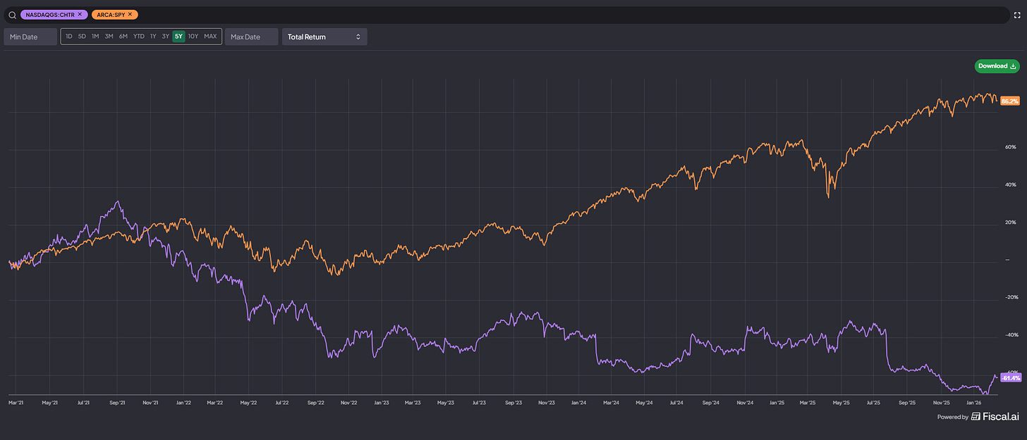 For those who don’t follow, cable’s core broadband had two burgeoning competitors over the past five years: fiber and fixed wireless (FWA). I thought (and continue to believe) that cable’s stock prices were pricing in absolute worst case outcomes for how that competition evolved. To be fair, the competitive concerns have probably played out in about a worst case manner, and the stocks have been absolutely decimated. However, if you looked at the financials of the cable companies, it would be hard to match them up with “worst case scenario” or the absolute devastation we’ve seen in the cable companies’ stock price. For example, CHTR’s adjusted EBITDA has grown ~10% (from ~$20.6B to ~$22.7B) from 2021 to 2025. Is that great? Absolutely not, particularly when you think about the capex they’ve been spending to defend that EBTIDA. But I think you’d be hard pressed to match “EBITDA slowly growing” with how CHTR’s stock has performed: