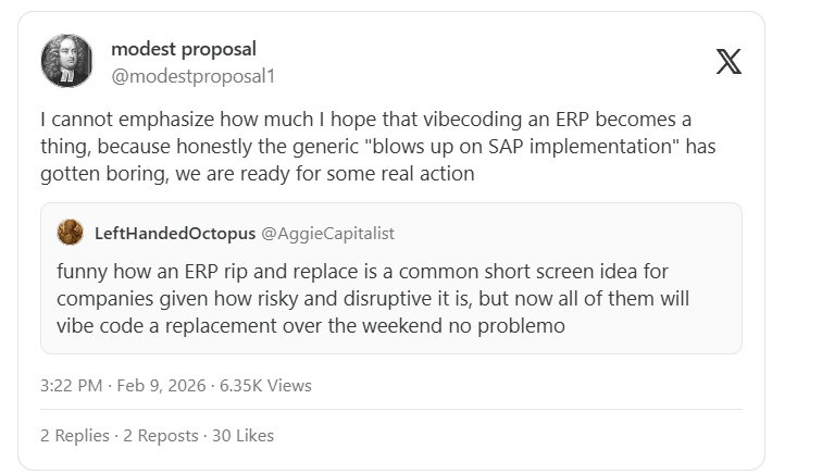 SaaS companies have never had to worry about the “I can copy it” short thesis; it took teams of software engineers to build and code these businesses. But suddenly you’ve got articles with financial journalist vibe coding working copies of multi-billion dollar businesses.