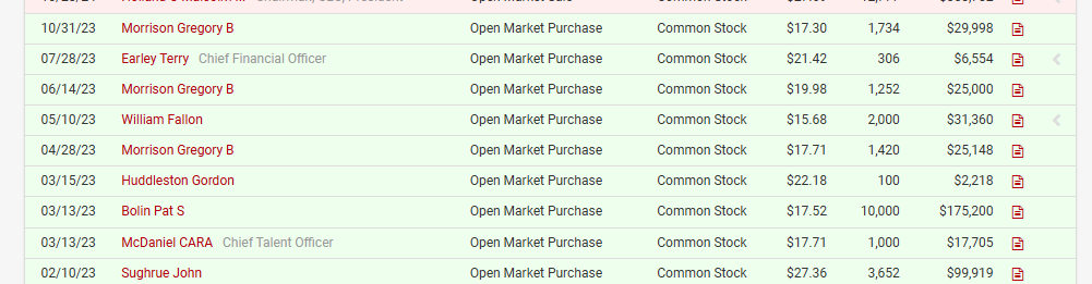 There’s no one thing that ends a panic in a sector, but a really good starting spot is to see a bunch of insider purchases or some big buyouts in the sector. One of the things that got me so excited about regional banks in 2023 was almost every single stock in the sector had significant insider buying. For example, basically every board member bought a little VBTX in early 2023: