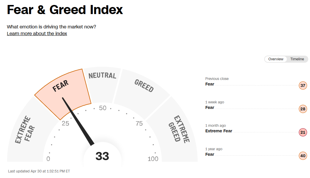 Last month, things were pretty rough (tipping into extreme fear). Things got even worse to start this month… but we’ve recovered quite a bit from the mid-month absolute “market is terrified1” post-Liberation day lows. I believe the “extreme fear” gage was tipping to the absolute lows then; we close the month firmly in “fear” territory.