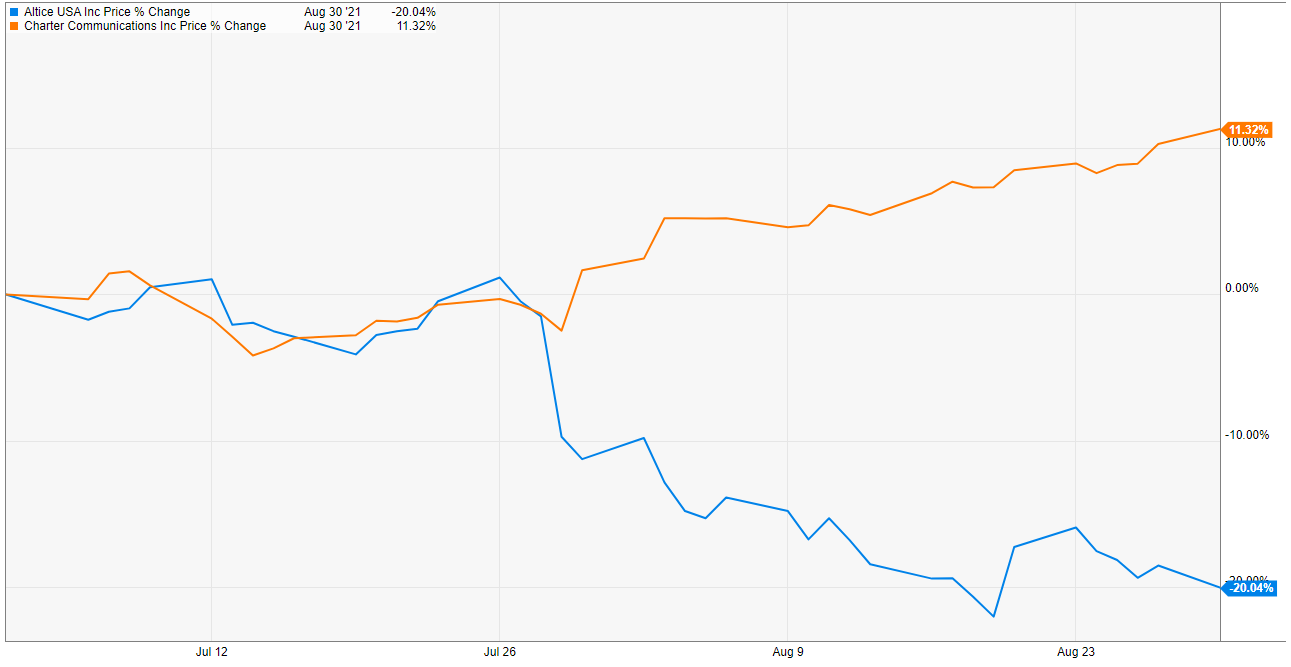 I completely jinxed Altice by calling it the “best” large cap stock in early July. Since then, it’s underperformed Charter by ~30% (and that underperformance has continued as I get set to publish).
