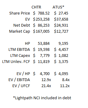 Altice’s strategy was to cut operational costs pretty deeply, flex their pricing power, and maximize near term FCF; Charter’s strategy was to keep their consumer prices low, invest in customer service, and maximize penetration because they believed that created the highest LTV. I believe it was Greg Maffei who said something along the lines of, “if ATUS’s strategy works, they’ll buy CHTR for a big premium; if it doesn’t, we’ll buy them in bankruptcy.” But it could have been Rutledge, Malone, Faux Greg Maffei, or even me who said that originally. At this point, I can’t remember!