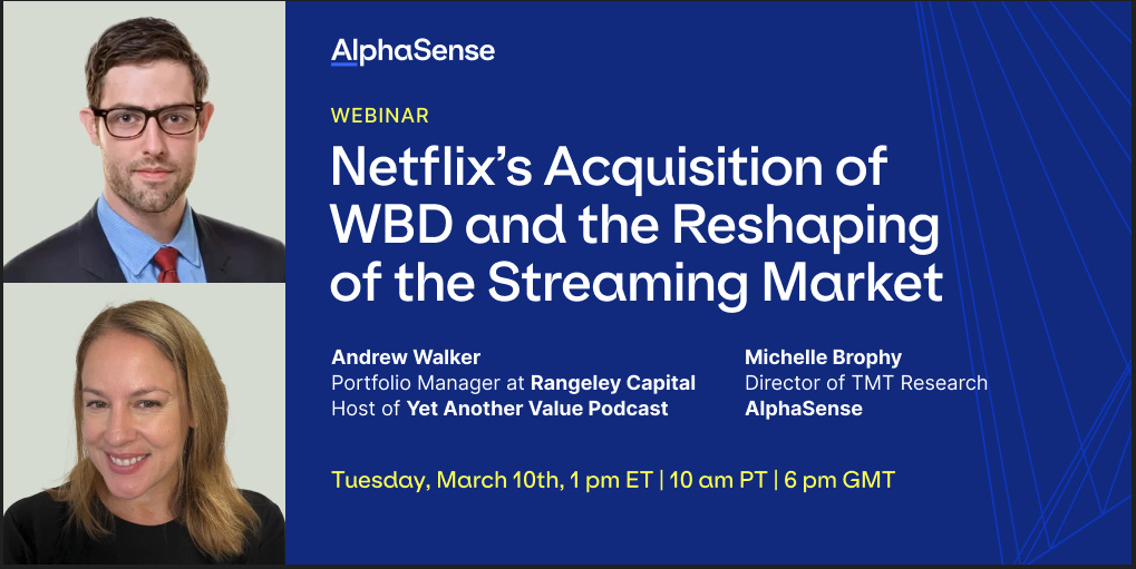 I’m doing a live webinar with AlphaSense’s director of TMT research on March 10th at 1 PM ET. We’ll be talking all thing media: Netflix / PSKY / WBD1 will probably be the headliner, but I plan on asking about all sorts of things: Disney’s new CEO, sports rights, the future of video games, etc. It’ll be a live webinar, so we will be taking questions from listeners in real time (a replay will be available if you can’t make it live!). If you’re interested, you can sign up here