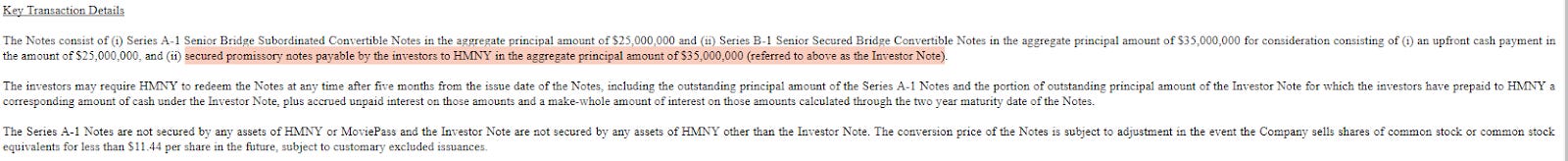 If MoviePass were to go bankrupt, this transaction is going to raise some pretty crazy issues. HMNY will need to go after the investor to collect that $35m note at the same time the investor is a creditor in their reorg and trying to collect on the convertible notes. It will get very silly very quickly.