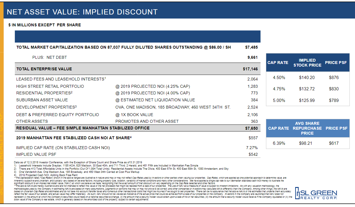 About a week later I was this quote on SLG's earnings call, where they argue that people prefer to invest in private real estate deals versus public market deals because private market deals allow them to avoid volatility / mark to market (as Modest Proposal put it, "illiquidity premiums are the new liquidity premiums"). That got me wondering: was the huge HHC "pop" an example of the market systematically underpricing land banks, or was it an example of mispricing public real estate assets? It's possible it's the later, and if SLG (or any of their peers that argue they trade at a huge discount to NAV) wanted to close the gap, they could do so rapidly and unlock a ton of value by running a sales / liquidation process... and if that's the case, all of these would be obvious activist targets (SLG, for example, argued in the slide below (from their June investor deck) that their intrinsic value is >$125/share, but their shares currently trade for ~$81; an activist could come in and rapidly close that gap by selling off buildings or forcing a sales process).