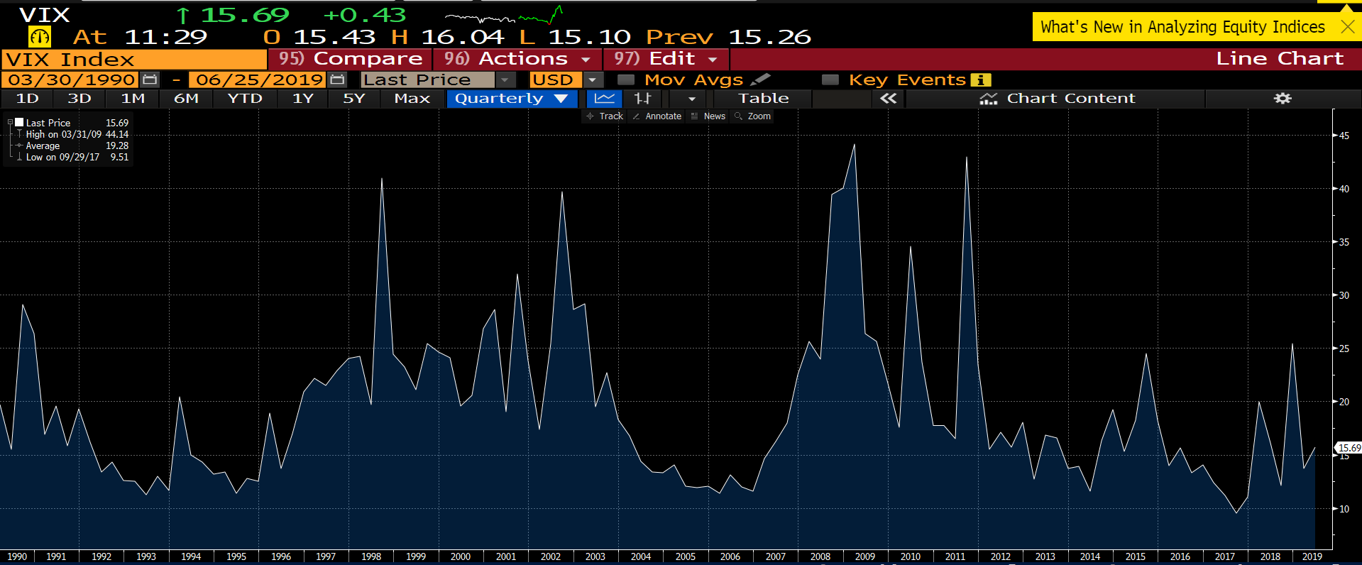 This is a bit more macro / market oriented than I normally think or talk about... but I've wondered recently if the market is underestimating the volatility in the world. I'm not talking specifically about the "Trump is running this country based on his daily whims" factor (though that's certainly a part of it!); I'm specifically wondering if the market is under-pricing volatility currently. I pulled the chart below from Bloomberg; it shows the VIX going back to ~1990. Today's VIX is ~15.7; that's probably a bit below the LT average (the chart says the LT average is 19; I feel like that's a bit skewed up by some higher vol times (i.e. one reading at 100 is going to really pull the average up) but I'm no expert). Anyway, at ~16 the market is basically saying we are in slightly less volatile times than normal.