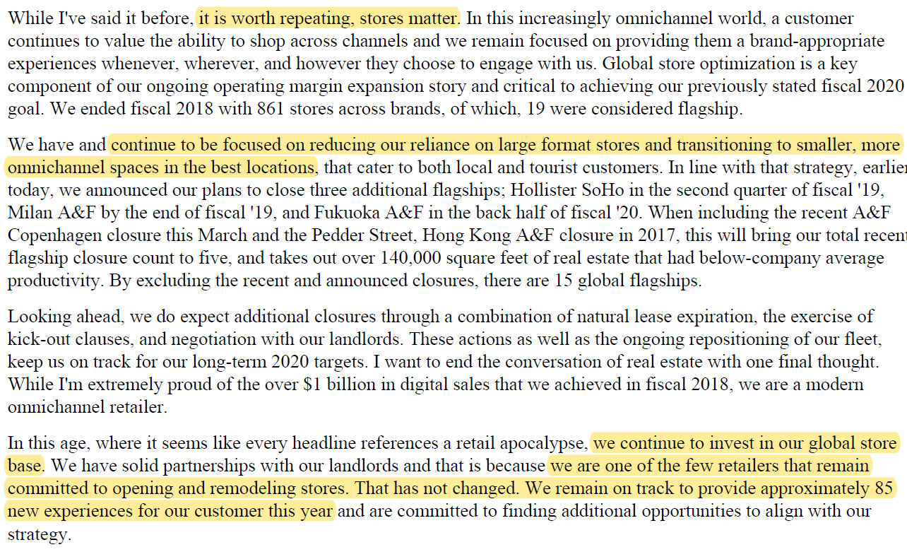 I'm long physical retail in a few different forms (mainly BPR, and mainly BPR through BAM (long both)) with an underlying thesis that 1) class A malls are in great locations, which gives them significant downside protection from redeveloping even if physical retail is going to zero and 2) online players are increasingly releasing that having physical store presence helps their online sales (for example, in my October links I linked to this piece on Warby Parker heading to malls), so this article obviously caught my eye a bit and made me wonder if the second piece of that thesis (physical stores boost overall sales) was getting called into question. Alternatively, it made me wonder if legacy physical brands didn't see the same overall / online sales boost from having physical stores for some reason (perhaps A&F didn't get an overall boost because they sprayed so much perfume in their stores customers couldn't see their phone screens through the fog?) or if legacy retailers did see some boost from having a physical store but weren't as sophisticated in tracking boosts to online sales. All of those assumptions proved wrong though; it seems A&F is seeing a boost from their physical stores, the flagship stores just probed too expensive to continue operating (see the quote below from their Q1'19 call). That is kind of interesting though; I wonder if it's a failure of imagination. Malls are increasingly looking to bring in experiences (escape rooms, gyms, more food courts, etc.), and I wonder if legacy retailers could make flagship stores work better by making the stores more about experiences. Not sure how that would work with A&F, but someone like Nike could turn their flagship stores into part gym / part retail space, or a golf retailer could have a VR Top Golf experience. There are tons of other options I'm sure I'm not thinking of, but I do wonder if flagship stores failing is more failure of imagination than failure of the retail space.