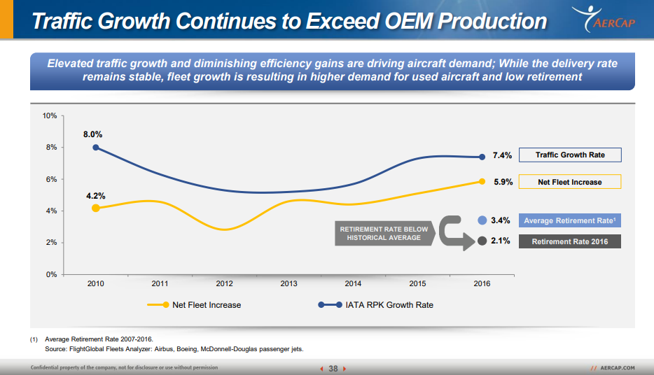 Just to drive the point above home a bit further; the chart below is from AER's (disclosure: long) 2017 investor day. It shows that air traffic growth has continued to exceed the increase in the air fleet, and that the retirement rate for planes has been below historical averages. What happens to aircraft pricing if the "net fleet increase" comes down (as I think it should given the aircraft production issues) while traffic growth continues to increase? What if the retirement rate increases too?