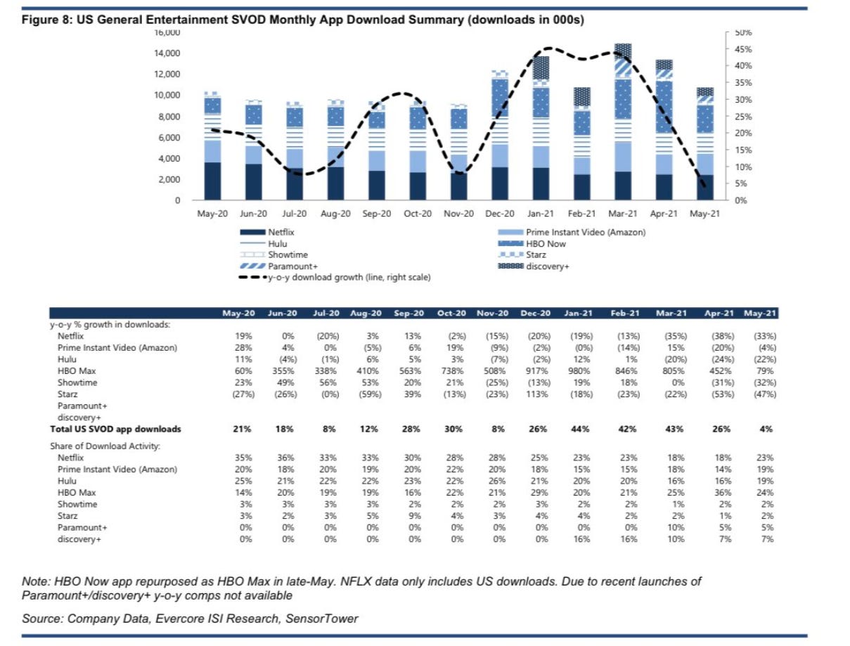 The second screenshot is App Downloads on a monthly basis. I think it’s interesting; HBO Max is consistently towards the top of download activity. Yes, that number should be taken with a grain of salt; for some reason, Disney+ isn’t on there, and I suspect most people already have Netflix on their phone. Still, it shows that HBO Max does have some momentum / appeal. And the Discovery numbers are interesting, as they appear to be significantly outpacing things like Starz or Paramount+