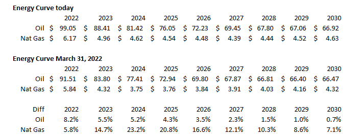So BSM is cheap. But I chose it for a specific reason: BSM’s stock is roughly flat this quarter (It was ~$13.50/share on March 31, 2022 and it’s $13.60 today). The energy curve across the board (see screenshot below) is way up over that time frame: medium term oil prices are up ~5% while medium term nat gas prices are up ~15%. Plus, prices have come down from their mid-May peaks, but prices were even than current strip higher intra-quarter, and BSM is not completely hedged, so they enjoyed some way above average profits intra-Q as well.