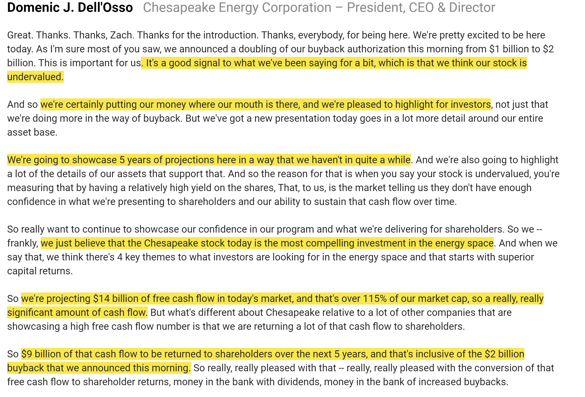 Consider, for example, CHK. They were at a conference last week, and they put out a detailed guide to what they would earn / do over the next five years at current energy prices. As I write this, their market cap is <$11B. The company is saying they’ll do $14B in FCF and return $9B of that to shareholders, so they’ll return almost their entire market cap and have an extra $5B in cash left over.