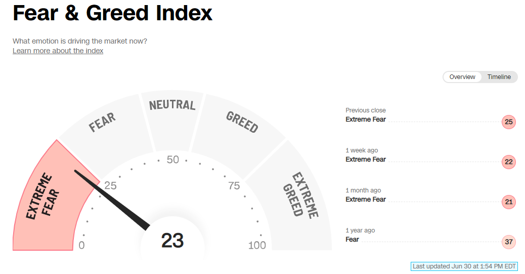 *I realize there are better ways to gauge this, but seriously fear is rampant. The “CNN Fear & Greed Index” has been flashing extreme fear for a month, and every investor I talk to trips over themselves to express bearishness on the market.